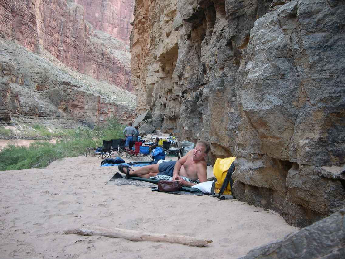 We must have been standing around on a beach somewhere around this part of the river when Josha remarked that the only way that most people should see the Grand Canyon from the bottom looking up was to be transported - in some kind of Star Trek transporter fashion - to the front tubes of one of our rafts for about three hours - certainly no more than four hours - so that they could experience the essence of our daily float downstream. The rock walls and sandy beaches crowded by tamarisk, the occasional rapid, the scrambling about on one shore or the other to scout a significant rapid - all these things could be made understandable and enjoyed but preferably only in small doses. The people who are actually down here are folks who had passed a difficult test - those who were willing to endure hour after hour and day after day of canyon style weather, living and sleeping on sandy beaches or rocky ledges and having an almost complete dependence on the river.