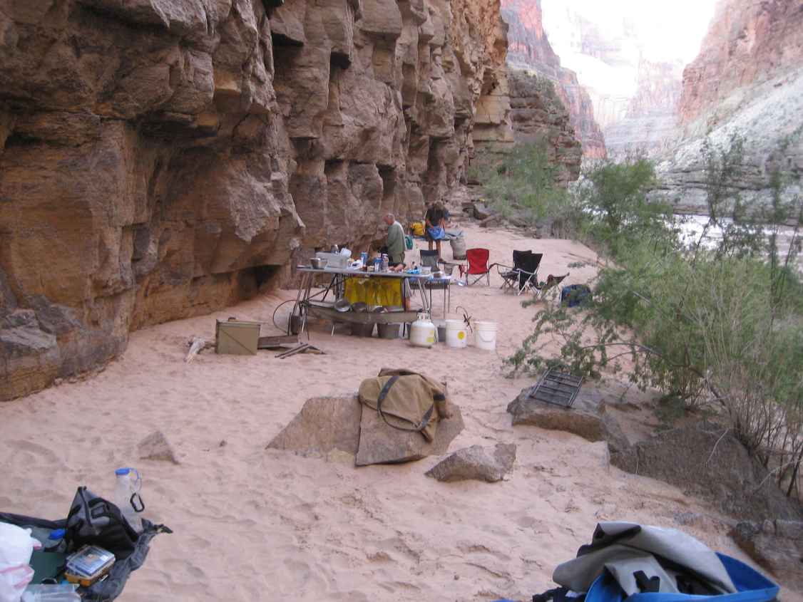 We pulled in at river left at mile 150.3 to make camp at Upset Hotel - the Sacramento group had claimed Ledges when we talked to them because their group was larger than ours. Upset Hotel involves a steep haul up a sandy slope to a long but narrow beach area at the base of a cliff. It was a hard shlep but everyone pulled their weight. We set up the kitchen, made dinner and avoided getting wet. The slight misty drizzle apparently evaporated somewhere above us.