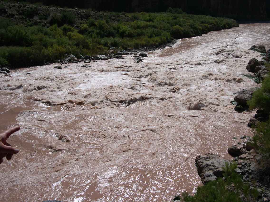 After loading up the rafts and launching into the current, we stopped at Olo Canyon to use the water filtering device again to top off some water containers that were forgotten the previous day. It was getting a little rainy as we passed Matkatamiba and we paused to scout Upset rapid river right - the Sacramento group joined us. The rapid involves missing a large center hole at the bottom and there are holes on the left at the top. The general maneuver is to enter right center and pull right. I ran that route but knew that I had little chance of completely avoiding the bottom hole. I pivoted early above and ran it down the center - we got wet but stayed topside up.