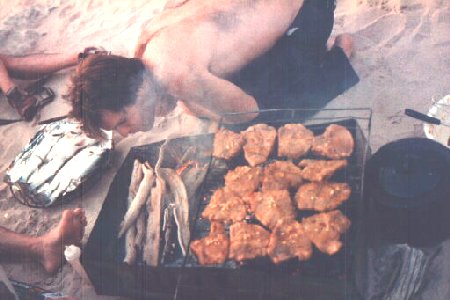 Ron caught four trout after we reached camp. The look on his face as he hurried over the crest of the sand dune to show off his catch was vintage ten year old boy. What a grin... So tonight we have for dinner broiled trout and sirloin shish kebob with salad, rice, wine and a few cans of beer for the plebes. Ron actually got all five fish with lures we found on the bush stuff that lines the shoreline. The longest was fingertip to elbow on my right arm. They've been put in the meat ice chest for tomorrow morning. Rebecca says trout almondine. I say wrap a strip of bacon around them. Fred says that they're salmon.