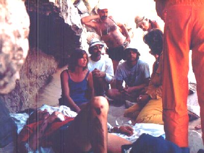 Late in the afternoon when only Dana, Rebecca and myself were in attendance, David decided that he wanted to go down to the beach where he could be more comfortable. The prospect of spending the night up there was not in his plans. He was probably just tired of laying on that slippery thermarest. After reminding him of Charley's adamant advice against moving, I helped Dana and Rebecca walk him down from the rock shelf to the sandy beach. "We need the others to help us move him", Dana said and I responded that the three of us were enough to help him down. Along the way, we paused in the shade and then gingerly moved down through a cleft in the rock wall, I with the firm intention of being the pillow should David trip or stumble. We successfully made it down and into the shade on the beach and heard that the advisability of moving David has been heavily debated by the others who are surprised to see us. We began supper and made David a lot more comfortable at the base of the rock cliff where it is cool.