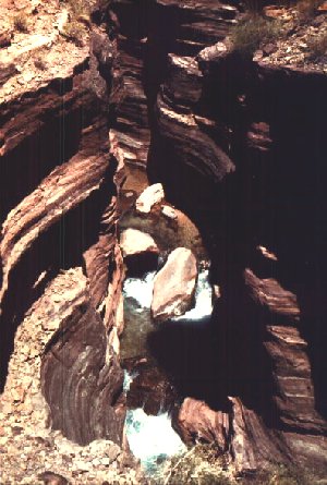 On our hike up the hill and into Deer Creek Canyon, Rebecca had grumbled at another of Ron's short hikes but gamely continued walking. At the top of the slope, we entered a serpentine canyon with the creek hidden below in a crack in the canyon floor. The canyon walls were rarely over 25 feet apart but the creek itself was a good 200 feet down from us. Unseen but heard. When the footpath dwindled to no wider than a shoe is long, Rebecca could go no further because of her fear of heights. We both returned to the river after a short pause.