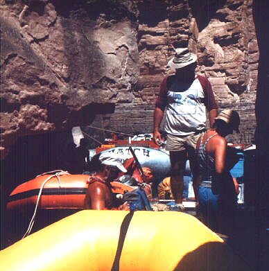 We've just made camp after a day spent in Havasu Canyon. Our campsite is a rock ledge protruding from the sheer canyon walls that define the course of the Colorado in this part of the Canyon. Opposite our campsite is the same kind of gray granite rock wall and at odd times it almost seems we are dwelling in a prison. Yeah, right! Fred is playing with his bongo set and the drum sounds roll satisfyingly off the canyon walls. Ron joins in with his Congo drum and a "e;Boy's Night Out"e; starts to shape up. The gurgling water's noise joins the usual domestic sounds of dinner, conversation, and occasional hoots of joy that echo from the far side of the river. Another big day in canyon country.We got on the river early, for us, and see only one group of baloney boats, a Hatch commercial outing, on the river. We pass a private group consisting of an Avon, a Caligari, and a River Rider. We made fast in a small eddy at the mouth of Havasu Canyon, tethering the boats to climbing gear affixed to a crack in one of the granite walls guarding Havasu from casual inspection by river traffic. The boats were lined up sausage style so we too could fit in the narrow space. Boaties sprawled in the orange Rogues gave us good advice in how best to go about seeing what Havasu had to offer us.