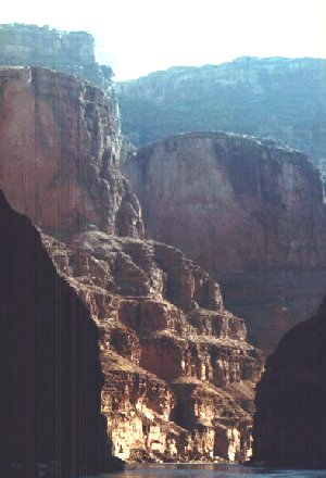 The weather is solidly socked in this morning, no blue sky, just dark clouds and a muggy feeling to the air. Every so often a warm breeze. We're out of the Middle Granite Gorge now and we have a much bigger sky and a wider horizon. This delightful trip is beginning to near its end, the brandy is gone and the beer stashers now hold power.Our day looks to be a nice one - less sun for a change. Lots of bats, toads, insects, lizards and such will miss us tonight, we'll be 20 miles downstream. The food continues to hold out, we have enough for 18 more days at least, though somewhat simpler meals would be an inevitable result of compressing the organic food into the last waning days of our trip. At least the rice cakes would get eaten and look, we've got lots of dry health food organo grains. Indians used to mash their molars over stuff like this. Spam for breakfast. Yum...